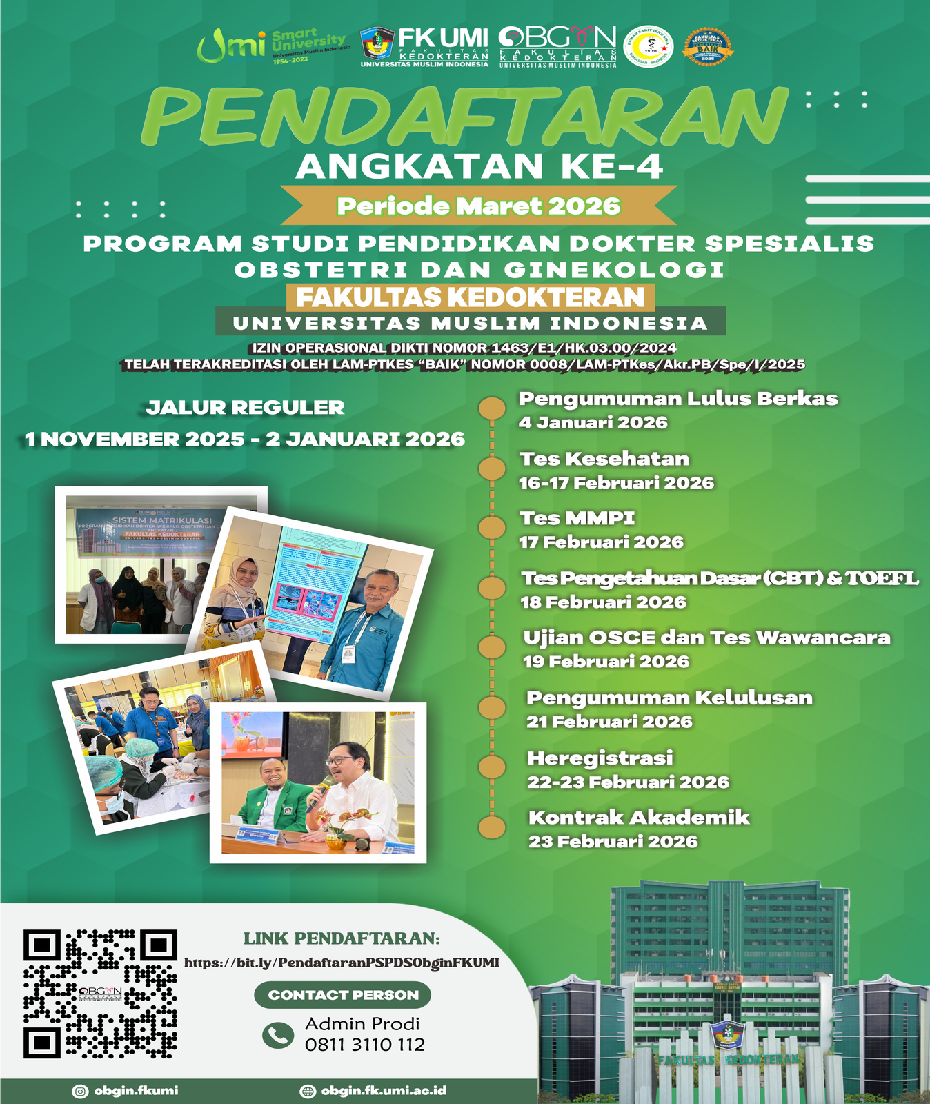 Informasi lengkap mengenai persyaratan, mekanisme pendaftaran, dan jadwal seleksi dapat diakses melalui website resmi Fakultas Kedokteran UMI Obgin FK UMI atau dengan menghubungi panitia penerimaan PSPDS Obgin FK UMI.