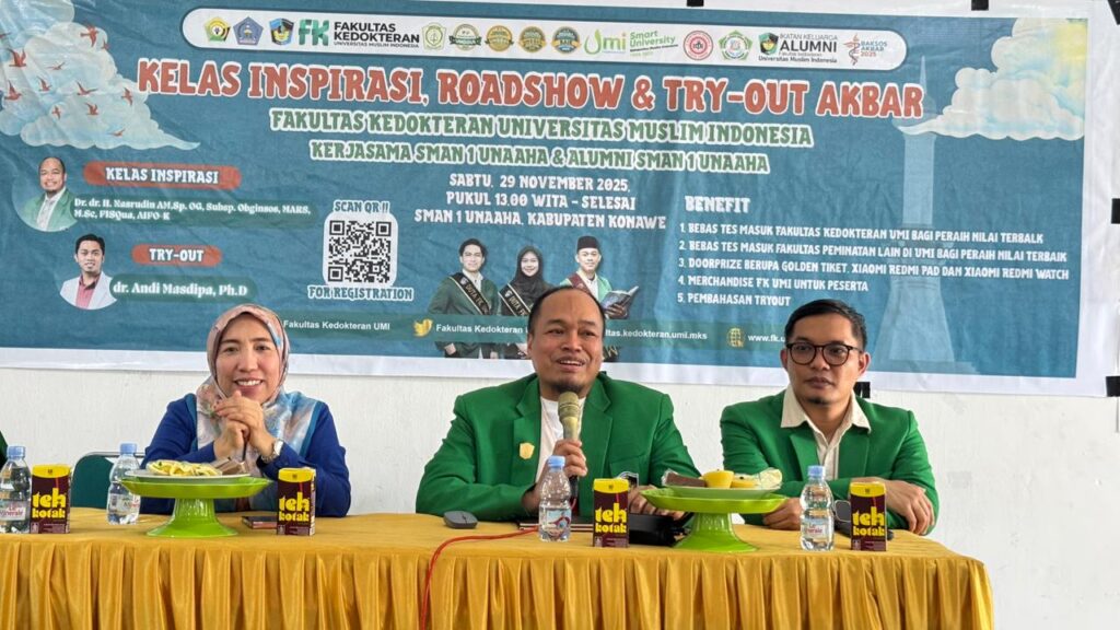 Konawe, 29 November 2025 – Universitas Muslim Indonesia (UMI) kembali melanjutkan rangkaian kegiatan Kelas Inspirasi, Roadshow & Tryout Akbar FK UMI 2025, dan kali ini SMAN 1 Unaaha, Kabupaten Konawe, Sulawesi Tenggara menjadi salah satu titik tujuan utama. Kegiatan ini disambut antusias oleh ratusan siswa yang berkeinginan melanjutkan pendidikan ke jenjang perguruan tinggi, khususnya ke Fakultas Kedokteran.